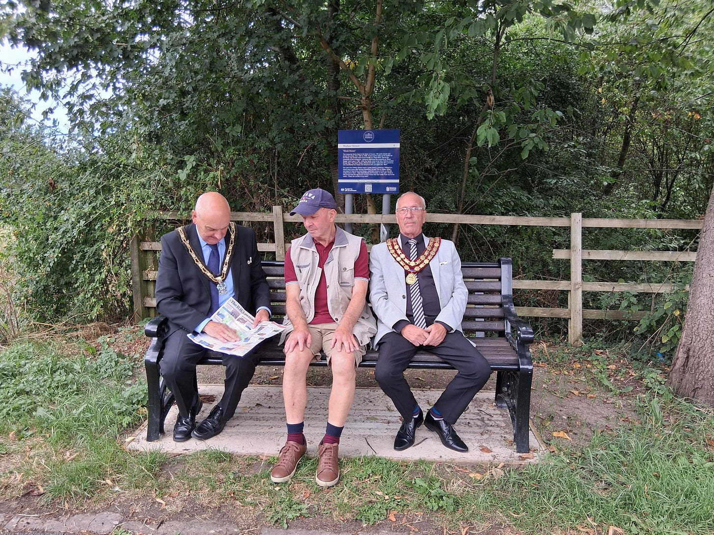 You may be thinking from this picture that the Beastie Boys have dug out their bling and reunited, but you are mistaken. This is Councillor Robert Bullock, David Amos, and Town mayor Ken Woodhead posing on a bench on the D.H. Lawrence trail to kick off the 2025 D.H. Lawrence Festival.