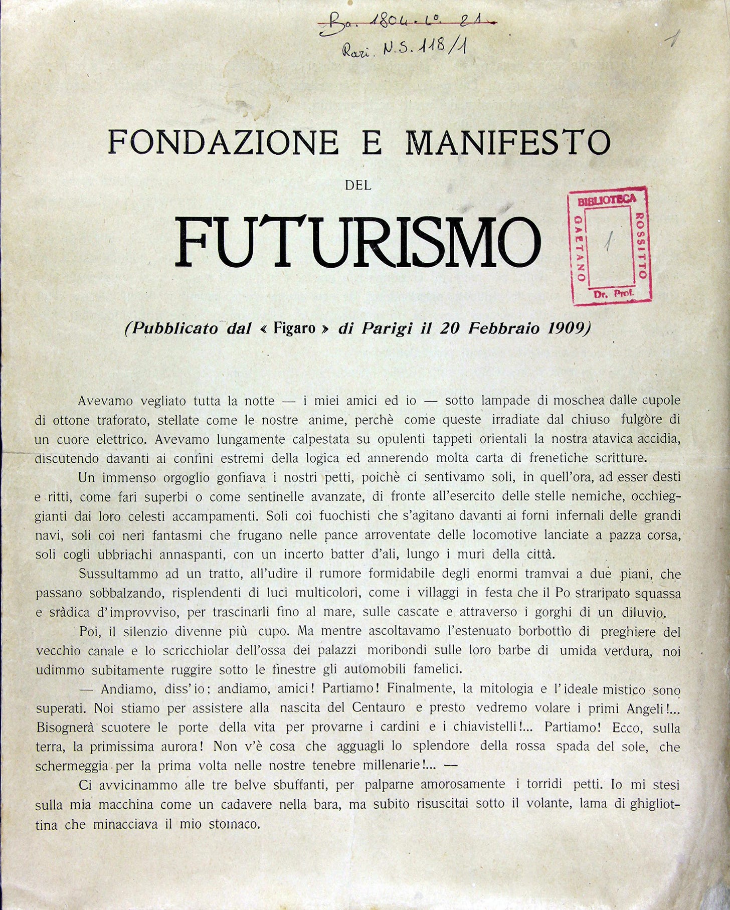 “Fondazione e manifesto del futurismo (Futurist constitution and manifesto) is the founding manifesto of the Futurist movement, first published in the Paris newspaper Le Figaro on February 20, 1909. Futurism was a short-lived artistic movement, founded in 1909 by the Italian writer Filippo Tommaso Marinetti (1876-1944). The goal of the Futurists was to discard the art of the past and to usher in a new age that rejected tradition and celebrated change, originality, and innovation in culture and society. The original Futurist manifesto of 1909, written by Marinetti, exalted the beauty of the machine and the new technology of the automobile, with its speed, power, and movement. The Futurists glorified violence and conflict and called for the destruction of cultural institutions such as museums and libraries.”